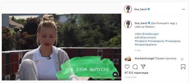 Это - интернет-платформа, предоставляющая творческим людям и другим независимым проектам возможность финансовой поддержки по системе подписок. То есть, если вы хотите посмотреть определенное видео, придется заплатить. Так, Тина Кароль сказала, что расскажет о ТОП-3 своих любимых мест в Киеве, мужских имен, стран для путешествий, песен с альбома "Красиво" и многое другое. В Instagram Кароль заинтриговала фанов, обнародовав лишь часть видео, где звучат только обрывки рассказа. "Отвечу честно.... Нежное отношение у меня к ним... Все ждут... Это прямое обращение и прямой мой месседж... Разные впечатления... "Скандал" мы хотели исключить из альбома....Тааак, людишки, вы все подписывайтесь", - интригует Кароль. "Для большего жду у себя на Patreon", - пишет певица. Заметим, что поклонникам не очень понравилось пренебрежительное обращение звезды к ним. "Людишки ???