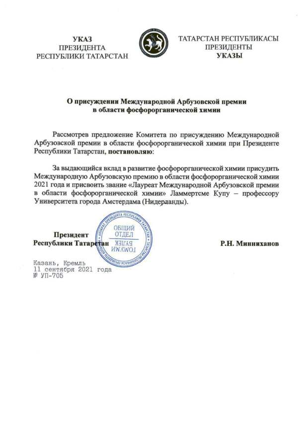 Международную Арбузовскую премию в области фосфорорганической химии присудили профессору Университета Амстердама (Нидерланды) Ламмертсме Купу. Соответствующий указ подписал президент Татарстана Рустам Минниханов. Звание лауреата премии присвоена «за выдающийся вклад в развитие фосфорорганической химии.