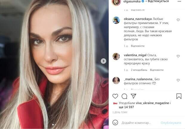Но видимо, артистке этого показалось мало и она захотела выглядеть еще эффектнее. Сумская применила к своим фото специальный фильтр, который заметно изменил ее внешность. В частности глаза актрисы стали неестественно большими. «Проба фильтра