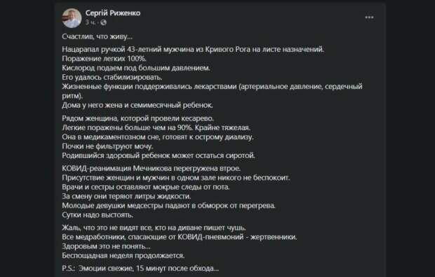 Присутствие женщин и мужчин в одном зале никого не беспокоит. Врачи и сестры оставляют мокрые следы от пота. За смену они теряют литры жидкости. Молодые девушки медсестры падают в обморок от перегрева", - поделился медик. Также он рассказал об особо "тяжелых" пациентах, которые сейчас находятся в больнице. "Женщина, которой провели кесарево. Легкие поражены больше чем на 90%. Крайне тяжелая. Она в медикаментозном сне, готовят к острому диализу. Почки не фильтруют мочу. Родившийся здоровый ребенок может остаться сиротой", - рассказал Риженко, отметив, что рядом с ней лежит мужчина со 100% поражением легких, которого только удалось стабилизировать. Напомним, за прошедшие сутки 31 марта болезнь была подтверждена у 17 569 украинцев. Глава Минздрава сообщил, что среди новых зараженных 813 детей и 486 медработников. Также неутешительная статистика и в смертности от вируса. В Украине второй день подряд фиксируют рекорд смертей от коронавируса: за прошедшие сутки болезнь забрала жизни 421 украинца. Напомним, что COVID-19 забрал жизнь известного врача в Украине, который вытягивал детей с того света: подробности трагедии А еще Politeka писала, наибольший показатель в Украине: Одесчина стала лидером по числу зараженных Covid-19 за сутки Также Politeka сообщала, что остановка транспорта и локдаун по всей Украине, Степанов выступили с заявлением: "Мы должны. .."