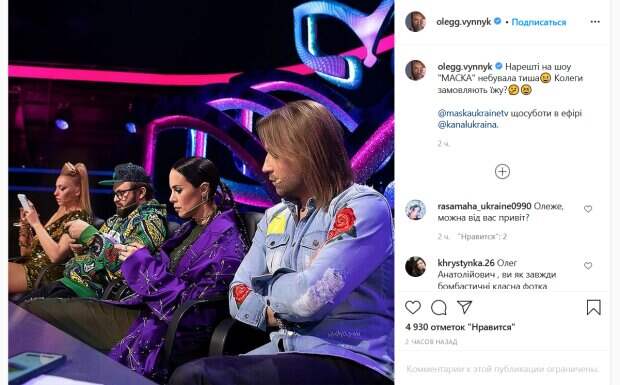В новом посте на своей странице в Инстаграм Винник показал, как ведут себя другие детективы в процессе съемок. Об этом пишет Politeka.net. На фото Полякова, Дзидзьо и Каменских сидят на своих местах, уткнувшись в экраны телефонов. Винник сидит рядом с ними и смотрит в их сторону, сложив руки на груди. «Наконец, на шоу «Маска» небывалая тишина. Коллеги Заказывают еду?», - с юмором подписал снимок певец. Украинцы тут же принялись комментировать его пост. «Олег, у Вас отобрали телефон? Или Вы коллегам текст новой песни надиктовываете?», «Олежа, а ты что на диете? Закажи хотя бы салатик», «А Андрей Данилко уже давно в столовой! Мудрый мужчина», «Нет, не думаю! Что-то замышляют», «Классно наблюдать со стороны, все в телефончиках, а Олега единственного не поглотил интернет», «У Вас не команда, а одни балаболы», «У Насти в телефоне интереснее?», - пишут люди. Напомним, Винник заполучил в свою команду на "Голосі країни" настоящий бриллиант, Дорофеева аж выскочила из кресла: "Очень круто!". Как сообщала Politeka, Олег Винник огорошил признанием о беременных от него девушках: "Друзья мои, это...". Также Politeka писала, что эффектный Винник сразил "волчиц" появлением во всем черном: "Весенний праздник любви".