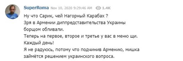 Каждый день!", - считает Цимбалюк. В то же время журналист уверен, что РФ после Армении возьмется Украину. "Я не радуюсь, потому что подчинив Армению, мишка (Россия - ред.) займётся решением украинского вопроса", - уверен Цимбалюк. Напомним, летом 2020 протестующие облили борщом посольство Украины в столице Армении, выражая возмущение в связи с заявлением украинского МИД относительно конфликта с Азербайджаном. Напомним, ночью, 10 ноября, по видеосвязи главы государств подписали трёхстороннее соглашение между Арменией, Азербайджаном и Россией о прекращении боевых действий в Нагорном Карабахе. После появления информации о мирном соглашении в центре Еревана собрались сотни протестующих, несогласные с решением властей. Протесты продолжались всю ночь. Напомним, Россия бросила армянских солдат на "съеденье" Азербайджану. Как сообщала Politeka, Азербайджан не оставил шансов Армении в Карабахе: перерезана главная "артерия". Также Politeka писала, что Азербайджан похвастался колоссальными трофеями на поле боя в Карабахе.