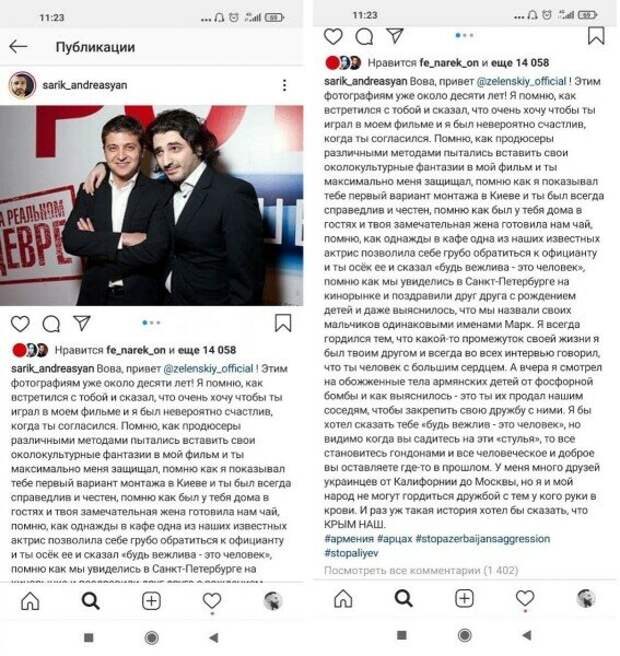 Окрім цього, одіозний режисер заявив, що в української влади "руки в крові". Зеленський, у свою чергу, не забарився із відповіддю. Він попередив режисера, що російська пропаганда продовжує обріхувати Україну, заявляючи, що Київ нібито постачає "фосфорні бомби" на Кавказ. "Тому, перш ніж казати щось про Україну, потрібно правдиво відповісти самому собі на просте питання: кому вигідно брехати про війни і про Україну? Чесно кажучи, мені особисто дуже шкода, що ти, людина, якій я відкрив двері свого дому і яка чудово знає мій внутрішній світ і мої цінності, так легко повівся на чужу пропаганду. Можна ж було запитати в мене особисто? Чи ні?", - запитав він у режисера, з яким працював десять років тому. Український президент також не розуміє, чому Сарік Андреасян мовчав, коли до України прийшли війна та російські окупанти. "Де ж був ти, коли війна прийшла до України і коли гинули наші діти? Коли гинули громадяни України вірменського походження, а їх не один і не два, а десятки! Що особисто ти сказав тоді проти агресії? Нічого? Розумію. Тому що це була не твоя війна! А сьогодні страшно стало, тому що цей жах прийшов і до твоєї домівки", - продовжив Зеленський. Підсумовуючи президент додав, що Україна виступає проти постачання зброї будь-кому, на відміну від країни-агресора. "Бо війни для неї – це хліб і кров. Мораль не може бути подвійною – для себе та для інших. Подумай про це. І, до речі, мого сина не звуть Марком", - емоційно резюмував Володимир Зеленський, відповідаючи на звинувачення Саріка Андреасяна.