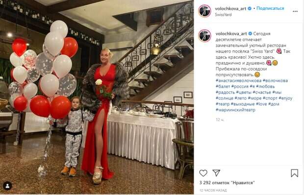 Несмотря на жаркую и теплую погоду, она пришла в ресторан в шубе и красном платье в пол. При этом балерина надела золотые босоножки на шпильке, совсем не подходящие к ее образу, а также зачем-то позировала с маленькой девочкой с шариками. Выставив голую ногу перед ребенком, Анастасия выглядела, как минимум, странно. Чтобы избежать комментариев по поводу своего вида и слов по типу "убери ребенка", Волочкова заранее скрыла комментарии. «Сегодня десятилетие отмечает замечательный уютный ресторан нашего посёлка "Swiss Yard"