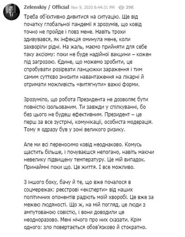Это уже за гранью человечности. Что ж, на мой взгляд, это люди с ампутированной совестью, и они доказывали это неоднократно. Мне нечего о них сказать. Кроме одного: зло возвращается обязательно и стократно", - отметил президент. Зеленский подчеркнул, что болезнь не может быть причиной для радостей, даже когда болеют оппоненты. "Надеюсь, и для большинства украинцев ковид не будет поводом для злорадства. Потому что мы нормальные. Абсолютно. За исключением небольшого количества субъектов, которые совсем утратили человеческие качества", - отметил глава государства. Напомним, 9 ноября президент получил позитивный тест на китайский вирус. Глава государства чувствует себя хорошо и будет продолжать выполнять свои обязанности в дистанционном режиме на самоизоляции. Напомним, что президент украинского государства Владимир Зеленский срочным образом созвал совещание СНБО касательно угрозы нацбезопасности страны. Как сообщала Politeka, Владимир Зеленский срочно обратился к Министерству здравоохранения касательно недостоверности статистики коронавируса. Также Politeka писала, что президент Владимир Зеленский потребовал усилить наказания за нарушения карантина в Украине.