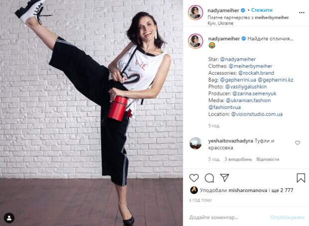 Так, на одной ноге у звезды классическая черная туфелька, на другой - белый ботинок на массивной подошве. На этом шалости Мейхер не закончились. Артистка высоко задрала ногу, демонстрируя отменную растяжку. Надежда, чей необычный образ дополнила красная сумочка-футляр, задорно улыбнулась в камеру. "Найдите отличия... 😂", - подписала фото знаменитость. Пользователи кинулись обсуждать увиденное и угадывать эти самые "отличия". "Туфли и кроссовки" "Что-то с лицом 🙈" "Надежда Ван Дамм💪😁🌹" "Туфли разные) и прекрасная растяжка🔥" "Разная обувь и серёжки, больше не нашла" "Чья туфля? 😂" "Круууто🙌 В одном фото, одновременно продемонстрировали свою потрясную растяжку🔥и как классика великолепно сочетается с casual👍👍👍 Камера, очень чётко запечатлила, ваш бунтарский дух пацанки-хулиганки😜🤘Надiйка, я обожаю когда, вы вся такая прикольная хулиганка🔥" Ранее мы сообщали, Мейхер покорила публику нежным образом в шелках. Певица примерила экстравагантное платье с платком в сером, синем и черном цветах. Наряд украсили сложные цветовые узоры. Надежда прислонилась к стене, обнажив одно плечо и томно наклонив голову. Напомним, что пышногрудая Мейхер пошла по стопам Волочковой и растянулась на камеру: «Балет для взрослых». Как сообщала Politeka, роскошная Надя Мейхер с раздвинутыми ногами показала свое счастье: "Хороша до невозможности". Также Politeka писала, что страстная Надежда Мейхер забыла про возраст и сверкнула формами в коже: «Вамп»