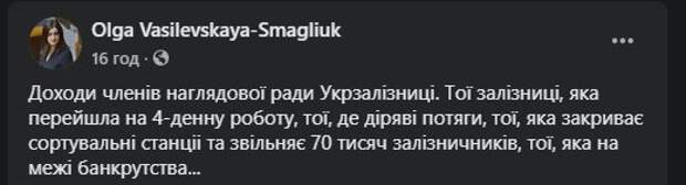 Стало известно о зарплатах членов наблюдательного совета «Укрзализныци» Как передает Politeka.net, файлом с данными поделилась нардеg от "Слуги народа" Ольга Василевская-Смаглюк на своей страничке в Facebook. "Доходы членов наблюдательного совета Укрзализныци. Той железной дороги, которая перешла на 4-дневную работу, той, где дырявые поезда, той, которая закрывает сортировочные станции и освобождает 70000 железнодорожников, той, которая на грани банкротства", - отметила народный депутат в подписи к файлу.