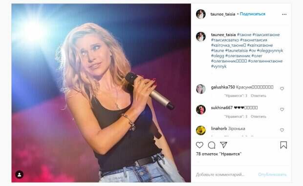 Так, в одном из аккаунтов появился жаркий снимок соблазнительницы в маечке. Красотка в таком виде блистала на сцене. Таисия держала микрофон и направила голубые глаза в сторону, ее лицо озаряла легкая улыбка. Черная маечка имела глубокое декольте, которое прибавляло образу Таюне пикантности. Кроме того, длинное украшение сияло на шее, опускаясь под черную ткань и ставшее отличным акцентом. Джинсы на высокой посадке шикарно выделило стройность звезды. За некоторое время пост собрал почти 80 лайков и немного комментариев. "Красотка", "Звездочка", ".....