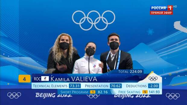 За произвольную программу «русская ракета» получила 177,13 балла. В сумме с баллами за короткую у нее 251,73 балла. Второй из российских фигуристок свою произвольную программу представила Анна Щербакова. Она выполнила четверной флип — тройной тулуп, четверной флип, двойной аксель, двойной аксель, тройной лутц — тройной риттбергер, тройной флип — ойлер — двойной сальхов, тройной лутц. Ей жюри поставило 175,75 балла, итоговая сумма баллов составила 255,95. Так она сместила Трусову на вторую строчку. 15-летнаяя российская фигуристка, уроженка Казани Камила Валиева выступала последней из россиян. Практически в самом начале выступления она упала. Свою программу фигуристка исполнила с ошибками — четверной сальхов, тройной аксель (касание рукой), четверной тулуп (степ-аут) — тройной сальхов (падение), тройной риттбергер, четерной тулуп (падение), тройной флип — тройной тулуп, тройной лутц — тройной тулуп (степ-аут). Жюри поставило ей . Итого — 224,09 балла. Это четвертое место. 15 января фигуристки выступали с короткой программой, по итогам которой лучшей стала Камила Валиева с 82,16 балла. Второе место по итогам было у Анны Щербаковой — 80,2 балла. Замкнула тройку лидеров спортсменка из Японии Каори Сакамото — 79,84 балла. «Русская ракета» Александра Трусова по итогам короткой программы заняла четвертую строчку с 74,6 балла. Напомним, в копилке российских фигуристов уже есть золото в командном турнире Олимпийских игр. Однако церемония их награждения сорвалась из-за положительной допинг-пробы Камилы Валиевой. Эта история вскрылась после выступления Валиевой в командном турнире — она стала первой фигуристкой, исполнившей прыжок в четыре оборота в программе Олимпийских игр. Ей далось исполнить два прыжка в четыре оборота — четверной сальхов (4S) и четверной тулуп (4Т). Так она в команде с другими российскими фигуристами — Марком Кондратюком, Анастасией Мишиной, Александром Галлямовым, Викторией Синициной и Никитой Кацалаповым — взяла свое первое олимпийское золото. С делом юной фигуристки в итоге разобрались и допустили ее до личного первенства, но Международный олимпийский комитет отказался проводить церемонию награждения фигуристов по итогам командного турнира на Играх в Пекине. Более того, там заявили, что если Камила Валиева войдет в тройку призеров, то церемонию награждения фигуристок в личном турнире тоже отменят. После того, как Валиева успешно выступила с короткой программой, в МОК предупредили, что если 15-летняя фигуристка войдет в тройку лучших, то результаты соревнований в женском одиночном фигурном катании на Олимпиаде будут считаться предварительными. В Олимпийском комитете с этим не согласились. Кроме того, ОКР уже направил в Международный союз конькобежцев (ISU) письмо, в котором указал, что результаты командного турнира на Олимпиаде не подлежат пересмотру. Дело в том, что антидопинговые правила сформулированы таким образом, что пересмотр результатов может пройти в том случае, если предполагаемое антидопинговое нарушение было совершено во время Олимпийских игр.
