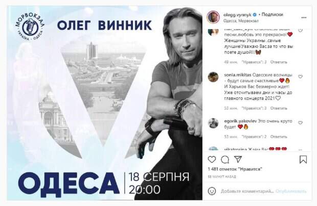 Олега изобразили на фоне Одессы, а также добавили логотип красавчика - круг с буквой V внутри. "К самому жаркому концерту в этом году осталось три дня! Моя солнечная Одесса, будем летать с тобой на ангельских крыльях, 18 августа жду всех на Морвокзале", - написано было под публикацией. Фанаты поставили более тысячи лайков и написали комментарии: "Спасибо,за ваши песни,любовь это прекрасно Женщины Украины ,самые лучшие!Уважаю Вас,за то что вы поете душой!!!", "Одесские волчицы - будут самые счастливые". И Харьков Вас безмерно ждет! Уже отсчитываем дни и часы до главного концерта 2021". Напомним, Олег Винник с «тайной женой» устроили незабываемый сюрприз для друга, кадры А еще Politeka писала, что Винник и его "тайная жена" слились в романтичном танце под хит Тины Кароль, видео Также Politeka сообщала, что "тайная" супруга Олега Винника добилась одобрения его верных "волчиц"