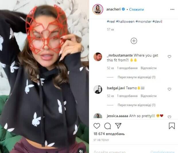 Модель предстает перед камерой в красном полупрозрачном белье и плеткой в руках. Фанаты буквально «взорвались» от увиденного. «Это пожар. Чертовски обаятельная», «а мне нравится эта твоя плохая сторона», «черт, девочка, да ты великолепна», «горячая штучка», «ауч, как это горячо. Всегда бы ты была такой», - пишут они. Как мы писали до этого, фитнес-модель Ана Чери показала дерзкий образ вампирши в честь праздника Дня всех святых. Девушка очень часто показывает в Инстаграм новые образы, которые примеряет в рамках рекламы одежды собственного бренда. При этом акцентирует Ана всегда внимание именно на бюсте, подчеркивая тот всевозможными способами. В этот раз модель устроила фотосессию в соблазнительном образе вампирши для взрослых. Напомним, Ана Чери забыла про стыд и сдавила аппетитные размеры прямо на камеру А еще Politeka писала, что соблазнительная Ана Чери порадовала, обтянув свой упругий "орешек" экстра мини Также Politeka сообщала, что Ана Чери поиграла на камеру своими "ягодками" в невидимом белье