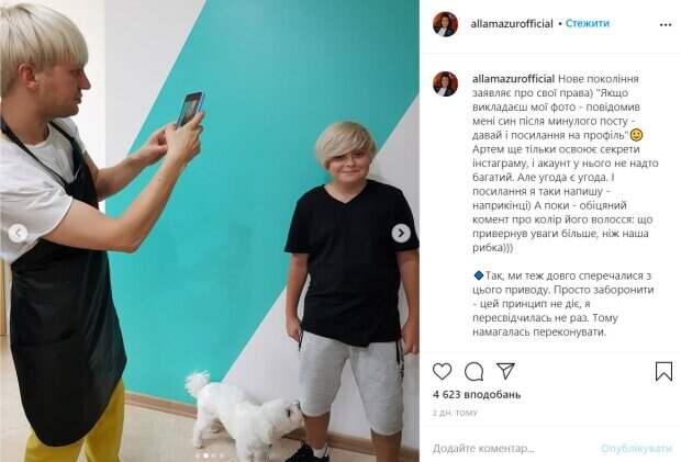 Известная украинская телеведущая Алла Мазур рассказала, как ее сын Артем решил поэкспериментировать со своей внешностью Как передает Politeka.net, об этом Алла Мазур рассказала в своем Instagram. 12-летний Артем на каникулах сменил образ и стал блондином. Алла Мазур призналась, что она сначала спорила с сыном по этому поводу.