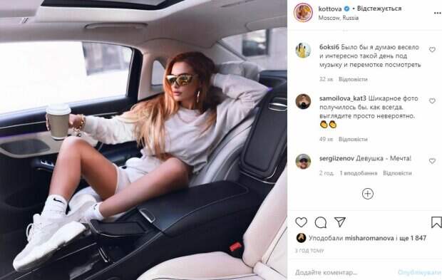 Певица задрала ножки, удобно устроившись в автомобиле. Об этом пишет Politeka.net со ссылкой на страничку знаменитости. "Вот так я езжу целыми днями... Только это постановочное фото, а если бы я вам показала всё на скрытой камере, то вы бы увидели как я почти живу в машине. Делаю прическу, мейк, переодеваюсь, созваниваюсь с командой, веду переговоры, работаю в ноуте, ем", - написала Татьяна под фото. Фанаты поставили почти 2 тысячи лайков и написали комментарии: "Плодотворной недели вам", "Красивая и ещё умная", "У вас невероятно красивая внешность. Вам очень идёт такой образ", "Бизнес-леди", "Девушка - мечта!". Сообщалось, что бывшая участница коллектива «ВИА Гра», модель и певица Татьяна Котова, блеснула ножками в задранной юбке. Котова позировала на природе, сидя на стуле. Красотка повернулась лицом к спинке стула. При этом Котова задрала свою белоснежную юбочку, сверкнув красивыми, ровными и загорелыми ножками. Напомним, томная звезда «ВИА Гры» забыла о лифчике и выронила свое великолепие из короткого топа Также Politeka писала, что экс-ВИА Гра Котова без одежды покувыркалась в постели, впечатлив размерами бюста А еще Politeka сообщала, что экс-ВИА Гра Котова в безумном декольте показала рай для мужчин