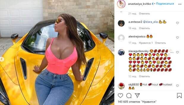 В этот раз Квитко похвасталась пышным бюстом в ярко-розовой, тесной маечке с тонкими лямками и подчеркнула талию благодаря джинсам светло-синего оттенка с высокой посадкой. На очередном своем фото Насте удалось выделиться, ведь позировала она, опиравшись на роскошное и дорогое авто. Специально прогнувшись в спине, девушка выставила бюст и отклонила голову в сторону. Пикантная поза не осталась незамеченной фанатами. «Que maquina !!!!; Да, любопытно, удивительно;