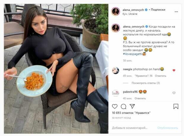 Известная модель Алена Омович, которую называют украинской Кардашьян, показала себя и рассказала о диете На фото Алена позировала в топе, который завязала на груди, шортиках и больших сапогах. Звезда сидела в кресле, а в руках держала тарелку со спагетти. Омович оставила волосы распущенными, а одну ножку задрала, хвастаясь тату на бедре.