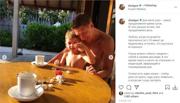 На одном из снимков полуголый Евгений Гашенко посадил сына Ивана на колени и вместе c поигрался ракушками за столом. Малыш с восторгом принялся разглядывать и разбирать сокровища, которые подарил им океан. Звезда "Дизель Шоу" также показал, как его жена прилегла на кровати, которую поставили на свежем воздухе рядом с бассейном. "Для меня утро - самое продуктивное время суток. И чем раньше встаю, тем продуктивнее день. Люблю, когда получается проснуться за 5-10 минут до будильника, и понять, что выспался и отдохнул. Утром можно побыть наедине с собой и своими мыслями. В это время никто и ничто не отвлекает от медитаций, афирмаций и планирования дня. Только есть один нюанс - чтобы рано вставать, надо рано ложиться... а когда же тогда смотреть сериальчики?", - поделился своими личными проблемами Евгений. Напомним, Евгений Гашенко из "Дизель Шоу" произвел фурор новой выходкой с трехлетним сыном. Как сообщала Politeka, звезда "Дизель Шоу" Крутоголов рассказал, как кутил на Мальдивах с женой и сыновьями: "Самое крутое это..." Также Politeka писала, что звезды студии «Дизель Шоу» изменились до неузнаваемости, совсем другие люди: "Крутоголов с шевелюрой, а Сморигин...".