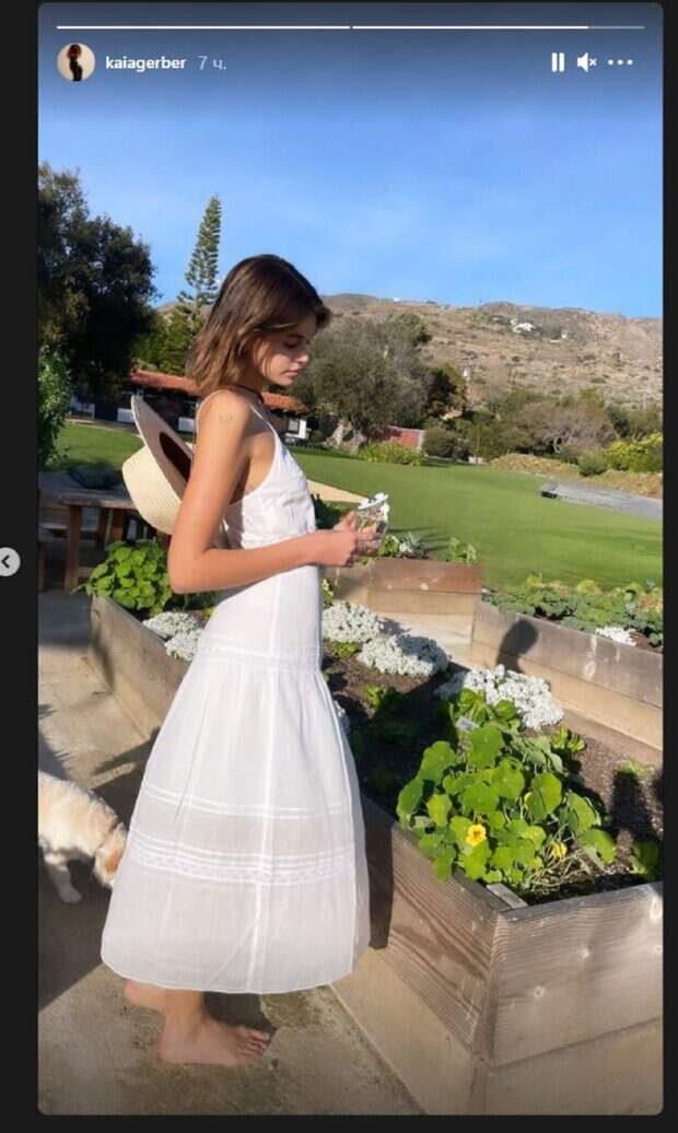 Известная модель Кайя Гербер, которая является дочерью Синди Кроуфорд, показала себя на прогулке На фото Кайя позировала в белом полупрозрачном платье, а дополнила образ стильной шляпкой, которая висела на спине. Девушка стояла у клумбы с цветами, а в руках что-то держала. Гербер была без обуви, гуляя где-то за пределами города.
