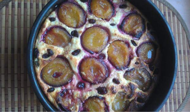 Уже в процессе готовки в доме будет стоять роскошный аромат слив и корицы - трудно дождаться, когда уже можно будет лакомиться. Что понадобится 0,5 кг творога; 3 яйца; 3-4 ст.л. сахара; 2 ст.л. манной крупы; 1 ч.л. лимонной цедры; 1 ч.л. разрыхлителя; 7-8 крупных сочных слив; 1 ч.л. молотой корицы; немножко изюма или сушеной клюквы (можно и без них); по желанию - пару листиков мяты.