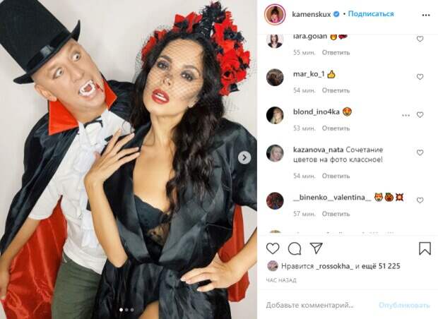 В этот же раз певица с мужем решила преобразиться в честь Дня всех святых и нарядилась в дерзкую ведьму, а Потап в классический костюм вампира. При этом Настя надела белье с кружевами, распахнула халат и впечатлила венком с цветами и черепом на голове. «Happy Halloween” Boo from us to u guys