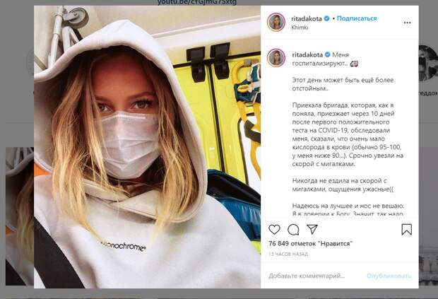 В начале августа, неделю назад, певица сообщила поклонникам — тест на ковид-19 оказался положительным. Кроме того, подозрения на инфекцию выявлены и у супруга певицы Федора Белогая. Для перестраховки пара трижды сдавала анализы, однако два теста оказались отрицательными. Лишь на третий раз тест показал наличие антител вируса COVID-19, а до этого Рита и ее возлюбленный Федор не самоизолировались Учитывая тот факт, что у пары коронавирус, врачи с определенной периодичностью приезжали домой, чтобы замерить жизненные показатели. Во время одного из визитов доктора выявили — у Риты слишком низкие показатели кислорода в крови. По параметрам общего состояния врачи приняли решения поместить певицу на постоянный контроль в стационар.