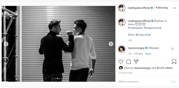 На первом снимке Топалов и Лазарев обнимаются, на других позируют рядом или о чем-то общаются. Влад одет в белый свитшот и черные штаны, на Сергее же можно заметить черные джинсы и пиджак. "Братья по оружию", - подписал фотографии певец. Сергей Лазарев прокомментировал запись и не стал скрывать своих чувств: "Обожаю". Пользователи, в свою очередь, тоже поделились своими впечатлениями от увиденного в комментариях: "Жалко до сих пор, что группа Smash распалась