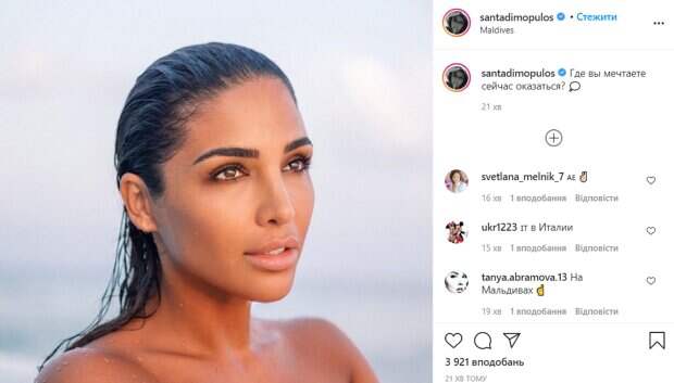 При этом, судя по всему, певица только что вышла из воды - у нее мокрые волосы, а капли еще стекают по ее телу. "Где вы мечтаете сейчас оказаться?" - спросила она у своих фолловеров. На фото певица указала геолокацию - кадр был сделан на Мальдивах. В комментариях пользователи соцсети написали свои варианты ответов, а также засыпали Димопулос комплиментами. Многие написали, что также мечтают сейчас оказаться на Мальдивах, ведь певица показывает очень живописные фотографии из этого места. "Божественная", "На Мальдивах", "Мальдивы", "Буковель", "После ваших сторис - на Мальдивах, это неописуемо красиво", "Какая красивая", "Ты супер", - пишут в комментариях. Как известно, сейчас Санта отдыхает на Мальдивах и охотно делится с поклонниками пляжными фото и видео. Особенно радуют фолловеров, конечно, пикантные фото в купальнике. Напомним, малышка-дочь Санты Димопулос из "Танцев со звездами" поразила видом на Мальдивах А еще Politeka писала, что победительница "Танцев со звездами" Димопулос в бикини показала похудевшую на 15 килограмм фигуру Также Politeka сообщала, что Димопулос из "Танцев со звездами" в бикини удивила загаром, кадр, как из фильма