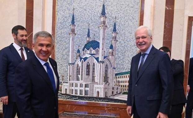 В этом большая Ваша заслуга, как посла России в Минске. Надеемся, что развитие сотрудничества Татарстана и Беларуси также способствует укреплению российско-белорусских отношений, — сказал он В свою очередь посол поблагодарил Рустама Минниханова и вспомнил свои визиты в столицу Татарстана. Фото: пресс-служба раиса Татарстана — Очень приятно принимать вас в нашем посольстве. Субъекты Российской Федерации активно приезжают в Беларусь. Ваша делегация в очень представительном составе. Я слышал, что коллеги успели активно поработать. Тепло вспоминаю все свои поездки в Казань. Прошу передать наилучшие пожелания Минтимеру Шариповичу, — сказал Грызлов. Рустам Минниханов напомнил, что Белоруссия на протяжении последних лет стабильно входит в число лидеров среди внешнеторговых партнеров Татарстана. Тем не менее потенциал объема гораздо выше, поэтому в том числе этот визит большой делегации Татарстана организован для увеличения торговли. Накануне Рустам Минниханов прибыл в Белоруссию с двухдневным рабочим визитом. Он уже встретился с представителями татарских общественных объединений. В ходе встречи раис поблагодарил соотечественников за вклад в сохранение родного языка и культуры. Подписывайтесь на telegram-канал и группу «ВКонтакте» «Реального времени».