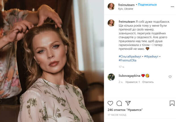 Ольга была одета в светлую прозрачную блузку, украшенную цветами. Ольга загадочно смотрела в кадр, пока ей делали прическу. «Я себе очень нравлюсь. Еще несколько лет назад у меня были претензии к своим манерам, внешности, перекличек двойных стандартов в сознании. Но долго работала над тем, чтобы душа гармонировала с телом - и теперь претензий нет», - подписали пост авторы аккаунта, используя слова Ольги. Стоит отметить, что на фото белокурая Фреймут выглядит превосходно. В свои 38 лет она старается следить за фигурой. На людях телеведущая всегда появляется с безупречным макияжем и укладкой. Ранее мы писали, что Ольга Фреймут заговорила о новом статусе. Телеведущая призналась, что будет хорошей бабушкой. Непонятно, почему звезда задумалась об этом так рано, ведь ее старшая дочка Злата еще даже не достигла совершеннолетия. Напомним, что скандальная Фреймут удивила неожиданным появлением в черных ботфортах и мини-платье: "Не ваш стиль...". Как сообщала Politeka, строгая Фреймут поразила семейным уютом на детском празднике: "Главное, что посуда красивая...". Также Politeka писала, что Фреймут без трусов и в мокрой футболке огорошила видом в священном месте: неожиданное фото.
