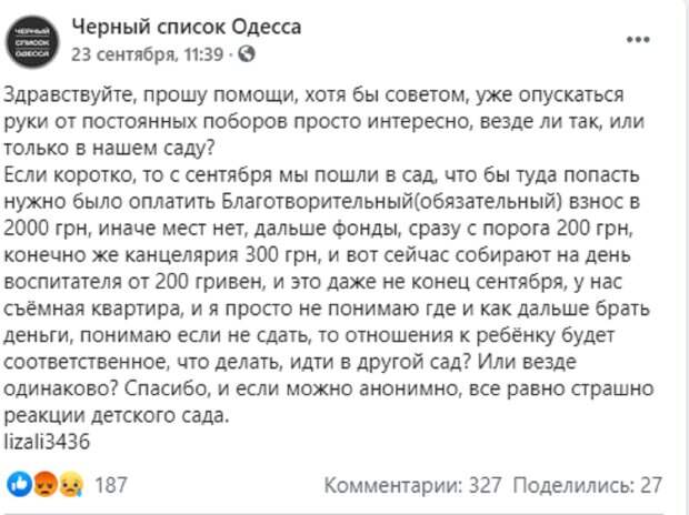При этом она боиться не сдать нужную сумму, чтобы не нарваться на негативное отношение воспитателй к своему ребенку. «Опускаться руки от постоянных поборов. С сентября мы пошли в сад, что бы туда попасть нужно было оплатить благотворительный (обязательный) взнос в 2000 грн, иначе мест нет, дальше фонды, сразу с порога 200 грн, конечно же канцелярия 300 грн, и вот сейчас собирают на день воспитателя от 200 гривен, и это даже не конец сентября», - написала мать ребенка. Женщина не понимает, где брать деньги на все эти поборы, ведь ее семья живет в съемной квартире и бюджет у них достаточно ограниченный. Она попросила совета у других людей, чтобы ей объяснили, такое во всех детсадах Одессы или это только у них. Одесситы утверждают, что такая ситуация наблюдается практически во всех городских детских садиках. «Это Вам ещё не сказали, что нужны шкафчики, постельное белье, полотенца, посуда, где-то крышу починить и т д)) всё впереди)) да, везде так», «Знакомого ребёнок в 203 сад, там вообще раздали списки что родители обязаны купить с каждого ребёнка веник!!!), куча канцтоваров, химии и т.тоже поборы жуткие», «Сколько сдавать на день воспитателя решают родители или род комитет. И бывает, что мамочки которые могут сдать такую сумму совсем не думают о других у которых нет возможности. У нас в школе на учителей по всем предметам собирают 250 грн, а тут воспитатель и няня не дофига ли?», «А я смотрю ничего с 1998 года ничего не изменилось, только помимо всех ежемесячных поборов был последний, так сказать на прощание, если не заплатишь, то документы и мед. карту с прививками не получишь», - пишут в сети. Напомним, что школьников передумали отправлять на дистанционку, новое решение Как сообщала Politeka, в Одессе школьников не пустят на занятия с 27 сентября: известно где Также Politeka писала, школы и вузы в Одессе закроют: "Дистанционки не будет"
