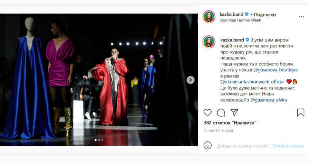 По словам исполнительницы, в показе звучала музыка их группы, а сама Зарицкая выступила в качестве модели. «Это было очень магически и одновременно важно для меня… Меня очень вдохновляет то, что сейчас происходит в модной и музыкальной индустриях Украины… Ну и стоит ли вам говорить, как волнительно мне было в роли модели? Но дальше еще больше. Поэтому оставайтесь с нами. Ох, этот год это что-то невероятное!», - написала Зарицкая. Звезда добавила, что видит свою цель в том, чтобы продвигать украинское во всем мире. На снимках ее можно увидеть на подиуме в черно-белом платье и роскошной красной накидке. Поклонники исполнительницы не смогли пройти мимо этого поста. «Саша лучшая», «Невероятная», «Люблю», - пишут люди. Напомним, солистка KAZKA Зарицкая заменила Осадчую в "Світському житті". Как сообщала Politeka, солистка KAZKA Зарицкая показала неподдельную страсть с партнером в закулисье "Танців з зірками". Также Politeka писала, что солистка KAZKA рассказала, что чувствует к своему партнеру по "Танцях з зірками".