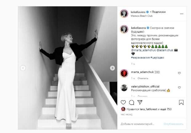 Известная актриса Вера Кекелия, звезда "Квартал 95", показала себя и рассказала о рекомендациях На фото красотка позирует в светлом платье и черном пиджаке. Звезда стояла на ступеньках и позировала для Марты Адамчук, коллеги по "Кварталу". На одном из кадров Вера распахнула пиджак, хвастаясь красотой в декольте.