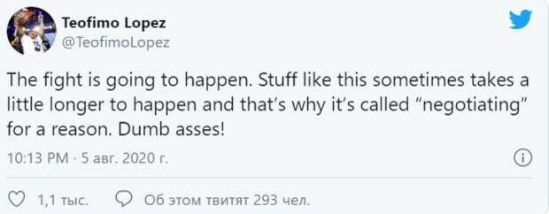 Американский боксер Теофимо Лопес (15–0, 12 КО), опроверг информацию, что его поединок с Василием Ломаченко (14–1, 10 КО) может быть отменен Как пишет Politeka.net, Тео Лопес написал в Твиттере: «Бой с Васей будет. Подобные вещи иногда занимают немного больше времени, и поэтому они не зря называются «переговорами».
