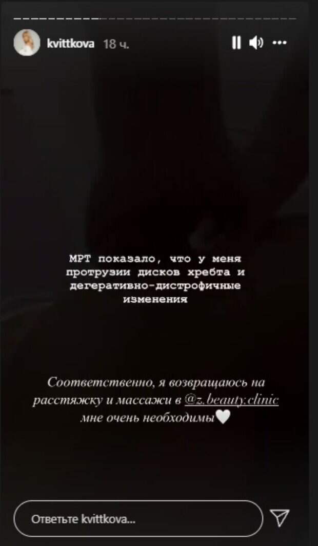 Блогерша и жена экс-"Холостяка" Никиты Добрынина Даша Квиткова огорошила откровением в своих "сториз" в Инстаграм. 23-летней девушке, недавно впервые ставшей мамой, понадобилась медицинская помощь из-за дискомфорта в спине. Даша сделала МРТ и поделилась результатом в соцсети, передает Politeka.net. Оказывается, у нее есть проблемы с позвоночником.