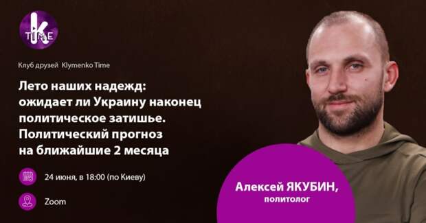Сегодня, 24 июня, состоится очередная встреча Клуба друзей Klymenko Time. У нас в гостях политолог Алексей Якубин. Тема: Лето наших надежд: ожидает ли Украину наконец политическое затишье. Политический прогноз на ближайшие 2 месяца Гость: Алексей Якубин, политолог Когда, где: 24 июня (четверг), 18:00, zoom О чем будем говорить: Наступило ли в Украине летнее политическое затишье или нас ждут новые политические кризисы Чего ожидать от визитов Зеленского к Меркель и Байдену в июле Саммит “Крымская платформа” и празднование 30-летия независимости Украины в августе: Украину ждет успех или провал Если вы хотите присоединиться к нашей встрече, задать вопросы, подискутировать, это можно сделать здесь: http://meetings.klymenko-time.com/ А постоянным участникам нашего Клуба друзей доступны все наши встречи в течение года — “полный “безлимит”, а также много других “плюшек”, включая наш закрытый чат с редакцией и ведущими https://club.klymenko-time.com/ Ваши донаты за участие во встрече и членские взносы помогают нам делать еще больше полезного и интересного контента для вас, наши дорогие читатели и зрители! Спасибо, что вы с нами!