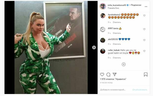 Известная модель Мила Кузнецова показала себя и рассказала о походе в кино На фото красотка позировала в костюме с большим декольте. Мила показала пышный бюст, который так и выпирал из него. Волосы у Кузнецовой были собраны назад, а на фоне можно увидеть постер Лиама Нисона. Звезда без стыда демонстрировала свой бюст, позируя в кинотеатре.