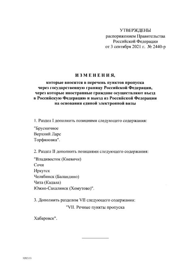 К воздушным пунктам пропуска правительство добавило аэропорты: Кневичи во Владивостоке, Баландино в Челябинске, Кадала в Чите, Хомутово в Южно-Сахалинске. Кроме того этот список пополнился аэропортами Сочи и Иркутска. Распоряжением Кабмина также созданы речные пункты пропуска. К ним приписан Хабаровск. скриншот распоряжения правительства России от 03.09.2021 № 2440-р Напомним, в России с 1 сентября 2021 года увеличили до одного года срок действия обыкновенных частных виз для близких родственников россиян. К таковым отнесены супруги, родители и усыновители, дети и супруги детей, братья и сестры, дедушки, бабушки и внуки. В новой редакции визового положения также указывается, что обыкновенная частная виза в РФ может быть однократной или двукратной на срок до трех месяцев либо многократной на срок до года.