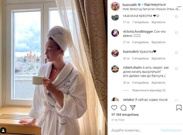 На голове у нее красовалось полотенце. Судя по всему, певица только вышла из душа. Кстати, на фото Бузова была без капли макияжа, демонстрируя свою натуральную красоту. «Последние дни так плохо и мало спала. А сегодня в любимом Балчуг наконец-то выспалась. Как всё-таки хорошо спать и быть во сне. Ведь во сне нет проблем, а даже если плохой сон - то можно проснуться, перевернуть подушку и проблема решена», - поделилась певица личными проблемами с фанатами. Менее чем за час пост артистки собрал почти 120 тысяч лайков. В комментариях ей оставили массу положительных отзывов. «Сон-это важно», «Красотка», «Обожаю отели, в них как-то все по особенному, а ещё можно все раскидывать и не убираться», «Какой прекрасный вид из окна», «Миром правит любовь», - пишут пользователи сети. Ранее мы писали, что Ольга Бузова попала в скандал после того, как провела эфир «Дом-2» в состоянии алкогольного опьянения. Такое поведение Бузовой шокировало ее коллегу Андрея Черкасова и участников шоу. Напомним, что раздетая Бузова расставила ноги и устроила такое, что стыдно теперь всем: "Колхоз". Как сообщала Politeka, Бузова неожиданно засветила новый бюст, очень жаркие фото: "Откуда?". Также Politeka писала, что эпатажная Бузова без стеснения осталась в одних трусах: "Фурор".