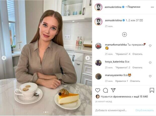 Сегодня актриса решила покорить поклонников строгим стилем - на Кристине простая светло-коричневая рубашка, верхние пуговицы на ней расстегнуты, однако в "рамках приличия". На всех трех кадрах Кристина сидит практически в одинаковой позе, и лишь присмотревшись можно понять, что разные на кадрах десерты на столике перед ней. " 1, 2 или 3?