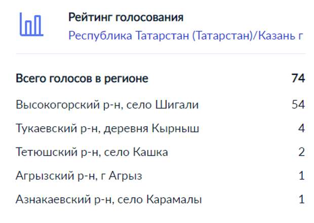 На портале Госуслуг России началось голосование за населённые пункты, которые подключат к высокоскоростному интернету в 2022 году. В их числе — 5 сел из Татарстана. Специальная форма есть сайте госуслуг. Татарстанцы могут проголосовать за село Шигали (Высокогорский р-н), деревню Кырныш (Тукаевский р-н), село Кашка (Тетюшский р-н), Агрыз (Агрызский р-н) и село Карамалы (Азнакаевский р-н).