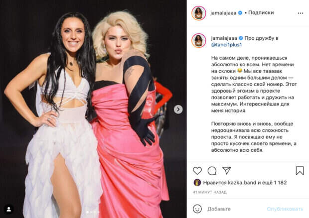 На этот раз певица опубликовала несколько фото на своей странице в Инстаграм. Как известно, уже состоялся третий эфир шоу "Танці з зірками". Проект уже успел покинуть Иван Люленов со своей партнершей Яной Цибульской и Александра Машлятина(девушка заменяла Анастасию Оруджову) с Денисом Самсоном. Джамала решила рассказать, какие отношения между оставшимися участниками проекта. Она показала соместное фото с Александрой Зарицкой в обнимку и также со Станисловом Горуной. "Про дружбу на шоу "Танці з зірками" На самом деле, проникаешься абсолютно ко всем. Нет времени на склоки