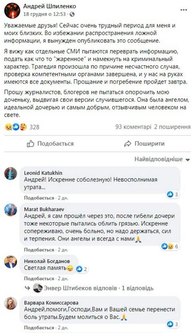 Трагедия случилась на следующий день после 19-летия Валерии Шпиленко. Андрей Шпиленко утверждает, что произошедшее было несчастным случаем. «Я вижу как отдельные СМИ пытаются переврать информацию, подать как что то "жаренное" и намекнуть на криминальный характер. Трагедия произошла по причине несчастного случая, проверка компетентными органами завершена, и у нас на руках имеются все документы. Прощание и погребение пройдет завтра. Прошу журналистов, блогеров не пытаться опорочить мою доченьку, выдвигая свои версии случившегося. Она была ангелом, идеальной дочерью и самым добрым, отзывчивым человеком на свете», - говорится в сообщении. По некоторым данным Андрей Шпиленко, у которого также есть 13-летний сын Илья, услышал крик дочери и, вбежав в ее спальню, увидел окно открытым. В Сети высказывают соболезнования: "Андрей, помоги, Господи, Вам и Вашей семье перенести боль утраты", "Искренне сопереживаю. И пусть Любовь окружает наших детей, где бы они не находились", "Искренне соболезную! Невосполнимая утрата". Андрей Шпиленко – бизнесмен и политик. Был заместителем руководителя аппарата фракции «Единая Россия» в Государственной думе, проректором Московского государственного университета технологий и управления. С 2011 года руководит ассоциацией технопарков и кластеров. Напомним, жуткая расправа в Киеве, мать убитой прервала молчание: "знала душегубов и..." Как сообщала Politeka, молодого актера-красавчика нашли мертвым: "уже третья жертва", детали загадочной трагедии. Также Politeka писала, что россиянин расправился с известным бизнесменом, но его настигла расплата: все подробности.