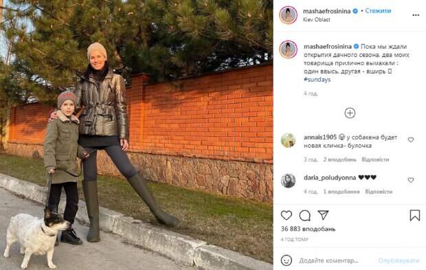"Пока мы ждали открытия дачного сезона, два моих товарища прилично выросли: один ввысь, другой - вширь", - пошутила Ефросинина. На новом фото Маша выглядит очень счастливой и позирует в стильных высоких сапогах-трубах в цвете хакки. Также на ней можно увидеть серые леггинсы, черную тунику, куртку бронзового цвета и бежевую шапку. На фотографии можно увидеть, что сын Александр действительно выглядит уже очень взрослым и заметно "вытянулся", а песик действительно неплохо "отъелся". "Все стройные! Собака красивая и ухоженная!", "Похож с мамой", "Та, что вширь, вообще на хорошего барашка смахивает", "Какие же вы красивые и сияющие!", "О, это же классно, как дети растут", "Какая красивая семья", "Выглядите очень счастливыми", "А какая порода вашей собаки?" - пишут фолловеры в комментариях. Напомним, что Ефросинина и Кравец из "Квартал 95" вызвали бурю эмоций своими перевоплощениями, видео: "Маша в роли...". Как сообщала Politeka, Ефросинина баловалась на диване и случайно показала неприличный жест: "в жестком протесте". Также Politeka писала, что Ефросинина поразила черно-белым фото с мужем и заговорила о сокровенном: "чтобы ценили каждую секунду...".