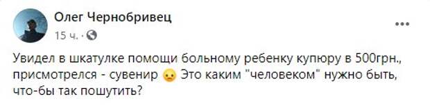 "Увидел в шкатулке помощи больному ребенку купюру в 500 гривен, присмотрелся - сувенир. Это каким "человеком" нужно быть, чтобы так пошутить? "- возмутился пользователь соцсети из Днепропетровщины. Он также опубликовал фото этого "пожертвования". В комментариях люди также выразили возмущение поступком и даже придумали, как проучить автора неудачной шутки. "Люди вообще совесть потеряли, просто нет слов, так шутить над больным ребенком, но ведь бумеранг никто не отменял", "побойтесь Бога, люди. Нет финансовой возможности или не желаете помочь, так пройдите мимо", "Этого человека надо отвести в онкодиспансер, чтобы он увидел, через что проходят люди, чтобы выжить, какие огромные деньги нужны, и увидел человеческую боль. Лучше бы прошел мимо и ничего не бросал", "Не дай бог, чтобы он (она) просил(а) о помощи, и так же сувенирами помогли. Земля круглая", - пишут днепряне в комментариях. Напомним, юная украинка осталась без ноги после ЧП в Польше, людей просят о помощи. Как сообщала Politeka, молодой отец пожертвовал всем ради незрячей дочери с ДЦП: "Я иду через себя и прошу...". Также Politeka писала, что 6-летняя Лера может победить рак, украинцев просят дать девочке шанс.