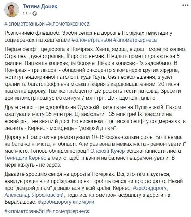 net. «Сделай селфи на дороге в Померках и выложи в соцсетях под хэштегом # километрганьбы # километркернеса», – призвала она, опубликовав два снимка: в Померках, на фоне разбитой дороги, и на улице Сумской, где висит инсталляция за десятки миллионов гривен. «Волны, ямищи, в дождь – море по колено. Страшная, очень страшная. Ее просто нет. Скорые километр преодолевают за 5 минут. Пациентов качает, им больно. Врачей качает - их задовбало», – описывает дорогу журналистка. Автор подчеркивает, что в Померках находятся три больницы: «Областной онкоцентр с командой крутых хирургов, институт эндокринной патологии, куда едут, без преувеличения, со всей страны, и многопрофильная городская больница с кардиоотделением. 20000 пациентов ежегодно. Там же и лабцентр, где делают тесты на ковид» Стоимость капитального ремонта этого километра дороги стоит максимум семь миллионов гривен. Однако ее не ремонтировали уже более десяти лет, ее нет ни на балансе города, ни на балансе области. Но, отмечает журналистка, если дорога в пределах города, то и ремонтировать ее должен город. Глава ХОГА пообещал направить Кернесу письмо, чтобы те взяли дорогу на баланс, однако там ответили, что не до нее сейчас. «Второе селфи - это чучело на Сумской, такое же – на Пушкинской. Вместе стоили городу 35 млн грн. Эти висюльки - 35 млн. грн. Их повесили на новый год и не сняли до сих пор. Потому что висюльки - это тысячи селфи в соцсетях, а значит - Кернес - молодец - "доверяй делам"», – иронизирует Доцяк. Татяна призвала всех, кто лечится в Померках, проведывает там родственников или едет мимо, делать селфи или просто фото. «Пусть о «доверяй делам» узнают во всей стране. Кернес, # зробидорогу, Александр Ярославский, делись километром асфальта с дороги на Барабашово. # Зробидорогу # Померки», – подытожила свою публикацию автор. «Зимой в 28-ую городскую больницу даже таксисты иногда отказываются ехать. Останавливают у онкоцентра и советуют дальше успешно пензлевать ногами», – пишет в комментариях еще один харьковский журналист Юрий Ларин. «А еще скорые останавливаются возле церкви и несут на носилках в кардиоотделение больных», – добавила Доцяк. Напомним, сломанный лифт в больнице вывел харьковчанина из себя. Как сообщала Politeka, харьковчанам показали, к чем привела нехватка медиков в больницах. Также Politeka писала, что у Кернеса оправдались за трагедию с пациентом в Харькове.