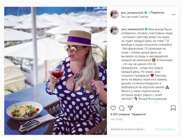 Известная певица Анна Семенович показала себя и рассказала о своей мечте На фото Семенович позирует в платье в горошек. Красотка дополнила образ шляпкой с синей ленточкой, а также круглыми очками. В руках Анна держала бокал с напитком, а рядом можно увидеть тарелку с едой. Звезда в этот раз показала, как отдыхает у моря, ведь на фоне видны белые зонтики.