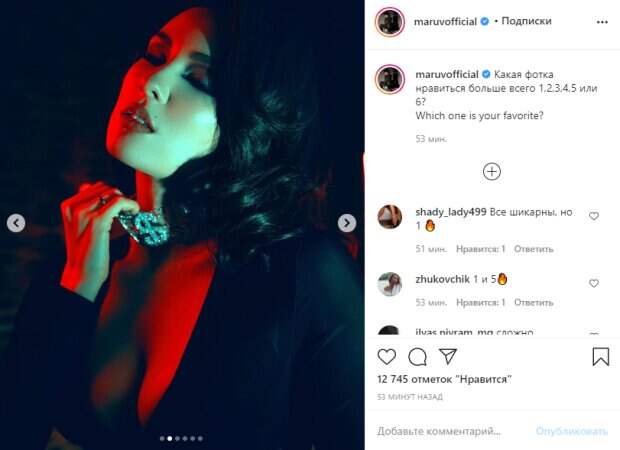 Соблазнительная MARUV покрутила спелыми "дыньками" под разными углами. Для еще большего привлечения внимания певица делала театральные жесты: то стаскивала с шеи блестящее украшение в виде символов "доллара", то ставила руки так, будто приготовилась молиться, или складывала ладони и пальцы в виде пистолета. "Какая фотка нравится больше всего 1,2,3,4,5 или 6?", - Анна заставила публику выбирать. Пользователи с жаром кинулись обсуждать увиденное: стоит отметить, равнодушных не было. "Все шикарны, но 1