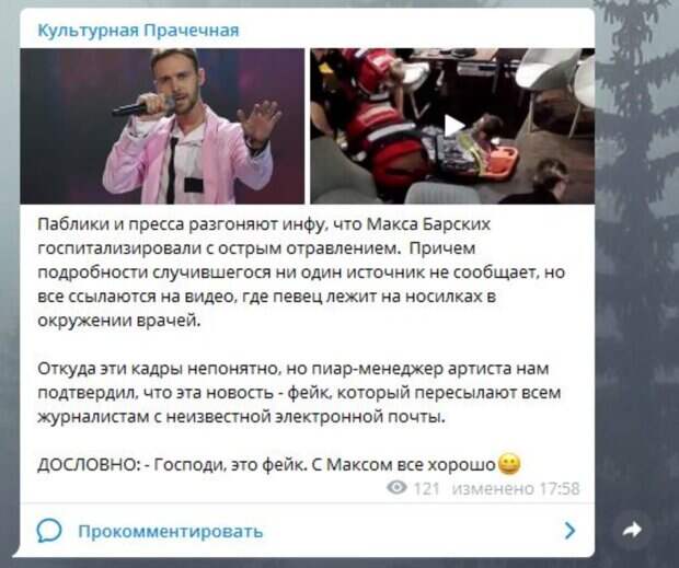 Журналисты связались с пиар-менеджером исполнителя Екатериной Хотеевой, которая опровергла эти домыслы. Она заявила, что на видеоролике в соцсетях не Максим Барских, а "срочная госпитализация певца" - оказалась фейком. "Это фейк. С Максом все хорошо. Вы вероятнее всего получили недостоверную информацию с неизвестного имейла и прикрепленным пресс-релизом, абсолютно отличающегося от официальных новостей, которые вы получаете о наших артистах", - заявила она в комментарии журналистам. Ранее мы рассказывали, что врачи сейчас спасают жизнь другой украинской звезды Григория Чапкиса. Так, 90-летний судья шоу "Танці з зірками" угодил 21 декабря в больницу с двухсторонним воспалением легких. "Врачи не берутся утверждать, что вируса нет. Потому что у меня возраст. В такой ситуации сложно определить, это воспалительный процесс из-за вируса или из-за возраста, - поделился Григорий Николаевич и добавил. - Я опасаюсь, что мог заразить свою жену. Это меня волнует. Я вообще больше всего сейчас переживаю за свою жену. Я же пообещал сделать ее счастливой, а тут такие проблемы", - признался популярный хореограф. Напомним, 90-летний Чапкис женился на молодой возлюбленной Как сообщала Politeka, 90-летний Григорий Чапкис едва сдержал слезы после долгожданной встречи с сыном Также Politeka писала, что 90-летний Чапкис после страсти на "Танцях з зірками" влюбился