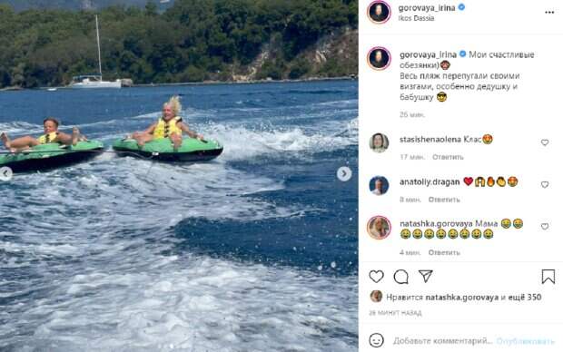 В последней публикации, Ирина показала, как ее дети 12-летний сын Андрей и 21-летняя дочь Наталья катаются на водном аттракционе. Ребята стремительно летят по воде с ветерком на надувной плюшке, которая прицеплена к скутеру. «Мои счастливые обезьянки)