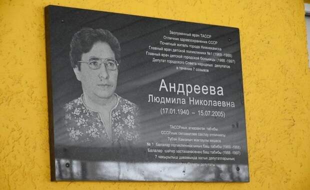 В Нижнекамске у входа в поликлинику №1 ДГБ с ПЦ установили мемориальную доску в память о первом главном враче детской поликлиники Людмиле Андреевой. Об этом сообщается на официальном сайте Нижнекамского района Татарстана. Данная поликлиника появилась при активном участии Людмилы Андреевой. Накануне ей исполнилось бы 82 года.
