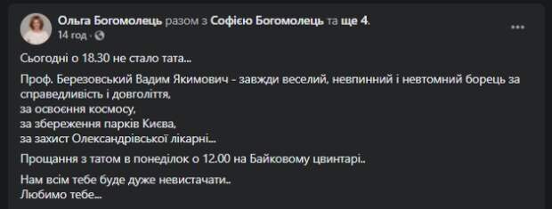 .. Прощание с папой в понедельник в 12.00 на Байковом кладбище. Нам всем тебя будет очень не хватать. Любим тебя", - говорится в сообщении. Причина смерти пока не разглашается. Вадиму Якимовичу за время его врачебной практики удалось сделать множество разработок, написать десятки монографий и сделать собственные открытия в области физиологии. Также он был личным врачом второго президента Украины Леонида Кучмы. Не так давно Украину потрясла новость о смерти директора Сумской городской детской больницы Святой Зинаиды Александра Емеца, который помог тысячам деток и имел просто колоссальнейший опыт. Также мы сообщали, что вирус унес жизнь врача Виталия Нетребовского, который спасал бойцов ВСУ. Церемония прощания прошла12 ноября в Полтаве. Напомним, жизнь легендарного украинца неожиданно оборвалась. Как сообщала Politeka, китайский вирус унес жизнь легендарного харьковского артиста. Также Politeka писала, что в Харькове оборвалась жизнь знаменитого врача и ученого.